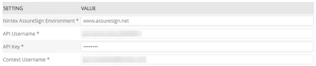 | API Key | Yes (required) | Text | 98nklsdflkw3op4u! | Your Nintex AssureSign API key. For more information see Setup Nintex AssureSign API Key/User. |