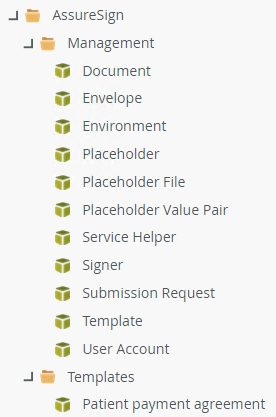 When you create an instance of the Nintex AssureSign service type, the service instance gets created in the Nintex AssureSign folder. You can find the Management and Template SmartObjects in the AssureSign category.