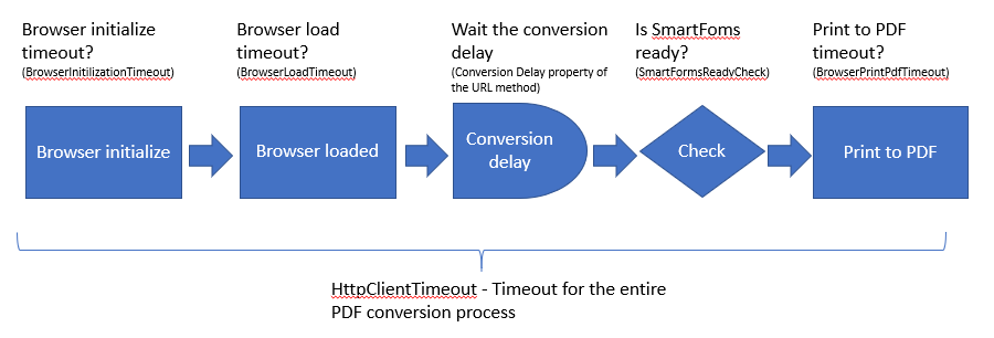 - The ConversionDelay waits after the BrowserLoadTimeout, and is applied before the SmartFormsReadyCheck and BrowserPrintPdfTimeout.