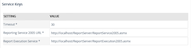 | Reporting Service 2005 URL | Yes | Text | http://localhost/ReportServer/ReportService2005.asmx | Enter the Reporting Service URL. |