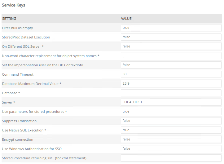 If this setting is set to True, stored procedure parameters are added as service object method parameters. All stored procedure parameters are added as optional or required parameters, and not as SmartObject properties. If set to False, the stored procedure parameter is returned as a property (typically as System.String[]). When you set this service key to false, you generate SmartObject properties for all stored procedure parameters. This may, however, result in having SmartObject properties that do not return data. When this service key is set to true, stored procedure parameters are added as service object method parameters and are tied to the method. This allows for the parameter to be properly passed to the stored procedure call without the added property on the SmartObject for return results. |