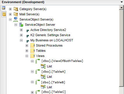 When service objects are created for the service instance, they are organized into categories for stored procedures, tables and views. The service object names will include the schema name of the entity in the database.