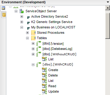 Service objects for tables that contain a Primary Key column will contain all the CRUD (Create, Read, Update, Delete) as well as List methods. If there is no primary key on the table, then only a List method will be created.