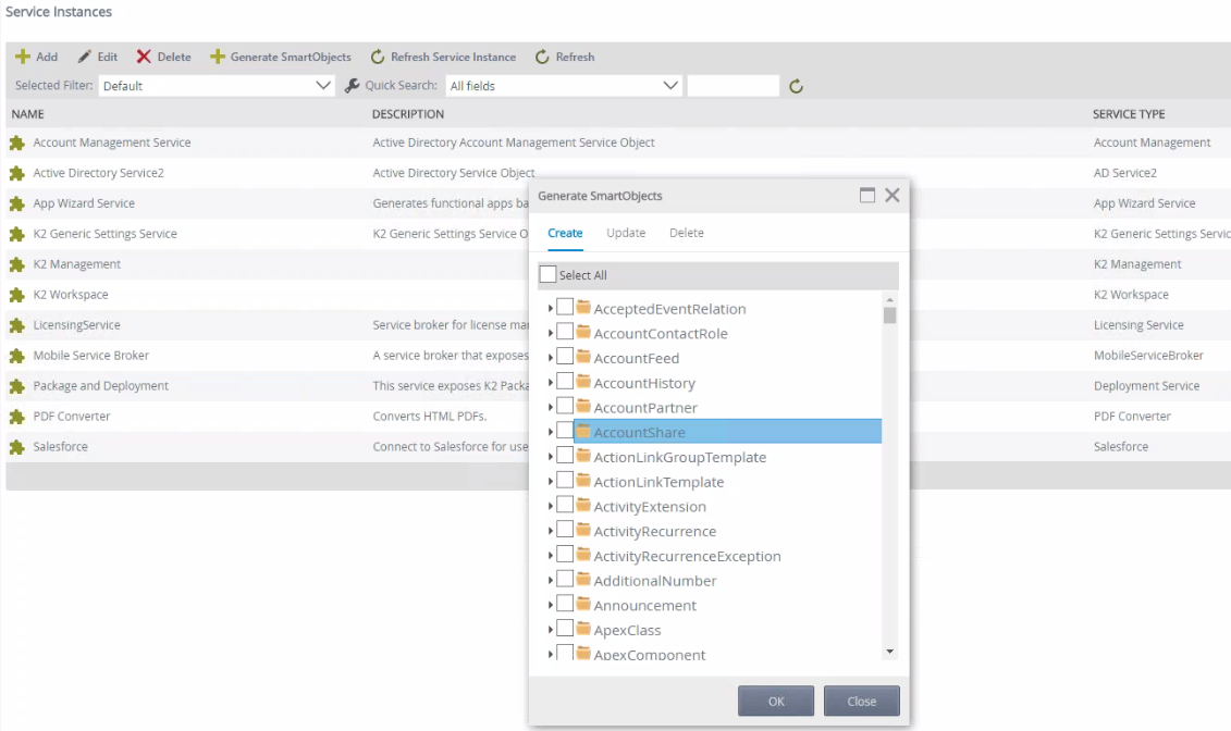 Salesforce feature activation does not auto-generate SmartObjects due to the time it takes to go through all available objects and describe them. Follow these steps to generate your Salesforce SmartObjects: