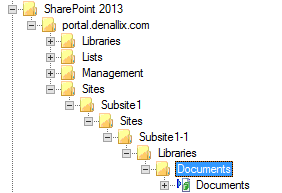 If the K2 for SharePoint app is added to a subsite of the site collection, it is added to the service instance that already exists for the site collection. The structure of the artifacts generated, such as SmartObjects, view, forms, workflows and reports, follows the structure of the site collection. For example, if you have a subsite called Subsite1 that is a child of your root site, and created a subsite under Subsite1 called Subsite1-1, when you add the K2 for SharePoint app to Subsite1-1 and generate at least a data app for the Documents library on Subsite1-1, the following structure is created automatically