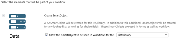 You can also use the SmartObjects link from the K2 for SharePoint Settings page to generate multiple SmartObjects at a time for selected lists or Libraries in the site. This is especially helpful if you need to use data from other lists and libraries on your site but do not need to create additional artifacts, such as views, forms, workflows and reports, for those lists and libraries