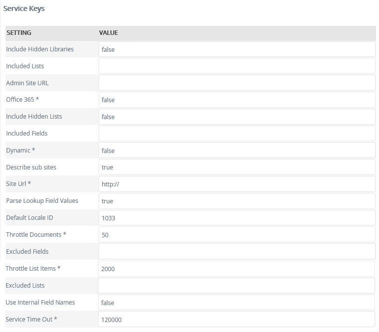| Service Time Out | Time intervals in milliseconds | (Required) Service registration time out. The default value is 120000ms (If increased this will allow for service to wait longer before it times out, this will be helpful if the connection to SharePoint is slow). |