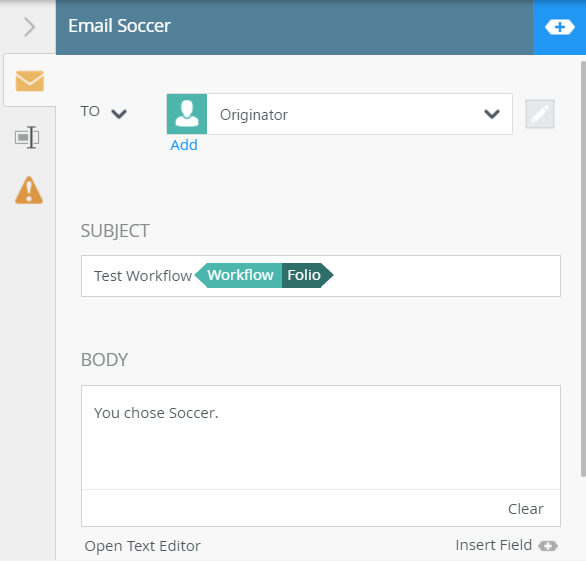 2. Now you will configure the email properties. For the subject line, you will use a variable from the Context Browser. At runtime, the variables are replaced with "live" data. For the Subject line, enter Test Workflow then append the Folio to the end of the line. The Folio is located in the Context Browser > Workflow tab > Workflow node. For the email message body, enter You chose Football.