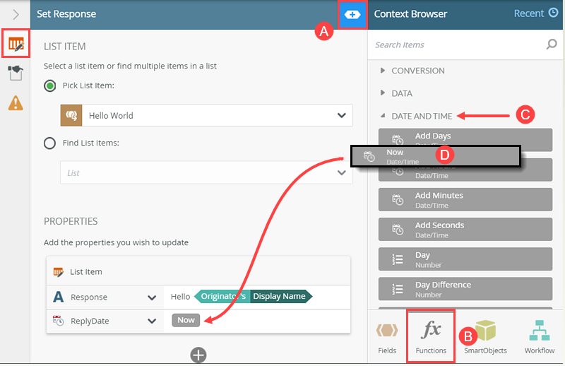- Expand the Context Browser (A). Click the Functions tab (B). Expand the DATE AND TIME node (C), then drag the Now() function (D) into the ReplyDate text box. Collapse the Configuration Panel.