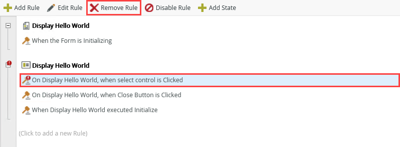 - Click the RULES tab. Remove the On Display Hello World, when select control is Clicked rule. This rule is left over from the Edit button, which you removed from the display view. Without the button, the rule is no longer necessary. Click OK for the confirmation.