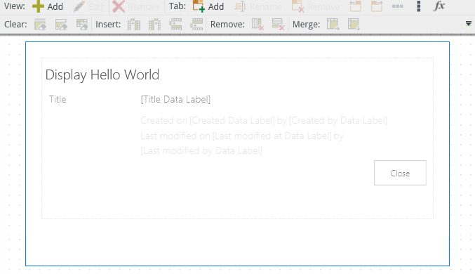 In this step, you edited the Display Hello World view and form to remove unused controls. You also removed the edit button. Since this is the display form, you don't need to change any content. You also removed the orphaned rule left behind by the deleted edit button. In the next step, you will create a new list view that displays all the records in your Hello World list.