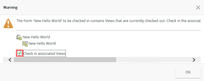 You may see a warning that the form being checked in has associated views. CHECK the Check in associated Views option, then click OK.