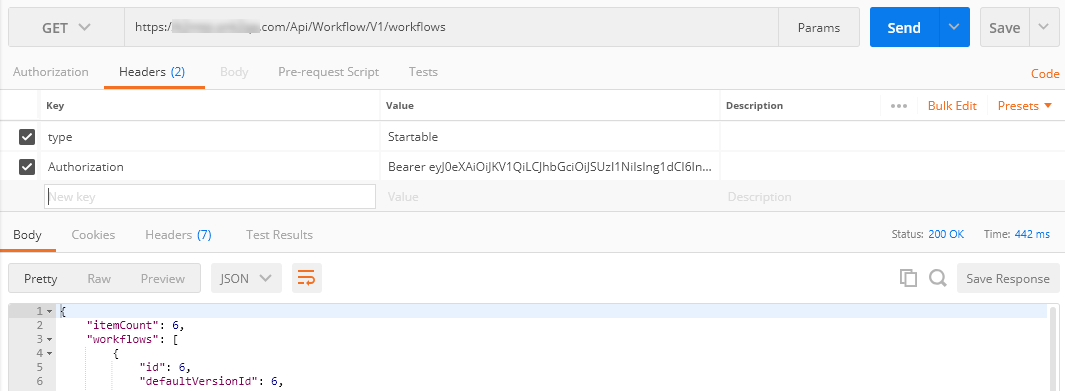 After you get the token, use it to make a GET call to the workflows endpoint. This call returns a list of workflows deployed to your K2 server and confirms that the server handles the incoming OAuth token correctly. For more information about using Postman, see How To: Use Postman to Test the Workflow REST API using OAuth.