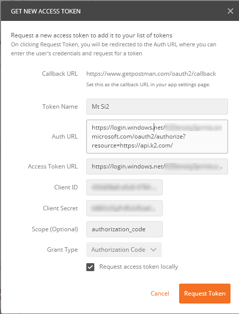 Use Postman to test your configuration. Add ?resource=https://api.k2.com/ to the end of your Auth URL in the Get New Access Token dialog as shown here:
