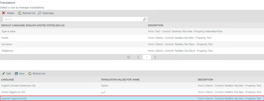 - Click Edit and type the value next to the language. Click Save to save the new translation value.