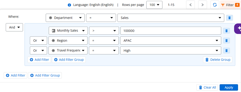 The filter query used for this criteria is: department+eq+%27Sales%27+and+%28monthlySales+gt+100000+or+region+eq+%27APAC%27+or+travelFrequency+eq+%27High%27%29