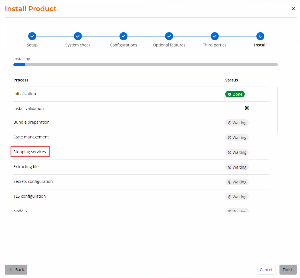 As a precautionary measure, you will not be able to cancel the installation or upgrade process after the Stopping services step (during installation) or the Backup step (during an upgrade). The following is an example of this: