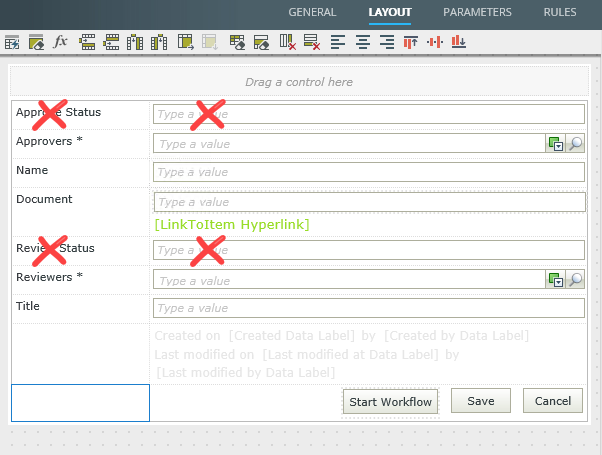 Select the Approve Status label, then click the <DELETE> key on your keyboard. - Select the Review Status control (text box), then click the <DELETE> key on your keyboard. You will see a Dependencies warning dialog. Select the option to Remove all dependencies, then click OK.