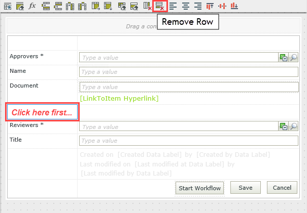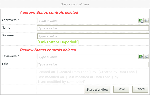 - You will delete the Approve Status label and control, then delete the Review Status label and control. The workflow updates both of these columns in the SharePoint list, so they are not needed on this view and could in fact, be confusing.