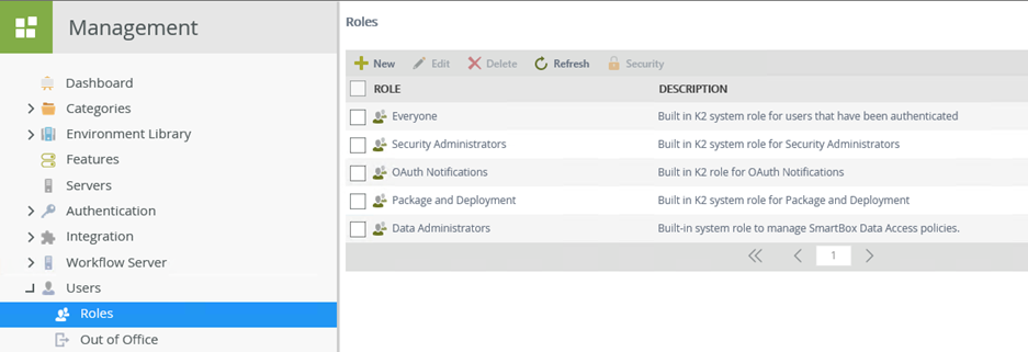 The Authorization.Role table includes all roles you create or are created by the installer or the system. This table as shown below contains the information defined for every K2 role.