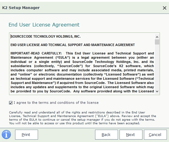The EULA describes the terms and conditions for installing K2 Five (in whole or in part). You can only install the software when you agree to the terms and conditions as outlined in the EULA.