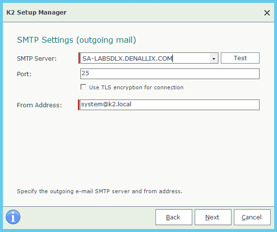This page configures the E-mail SMTP server used to send K2 related E-mail notifications. If you selected the Use Exchange for mail integration option on the Exchange Server Configuration page, you will not see this page.