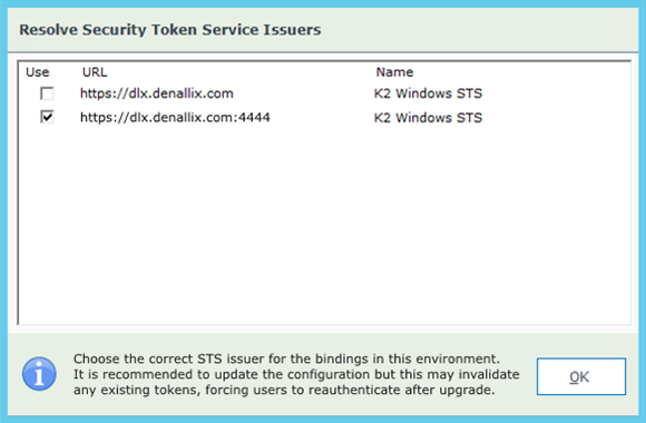 If the selected IIS binding in the Bindings page does not match the URI for the Security Token Service in the K2 database Identity.ClaimIssuer table, you will need to resolve which STS issuer to use. You do this by making a choice on the Resolve Security Token Service Issuers page. For more information on the IIS Bindings see the topic: K2 Site Configuration.