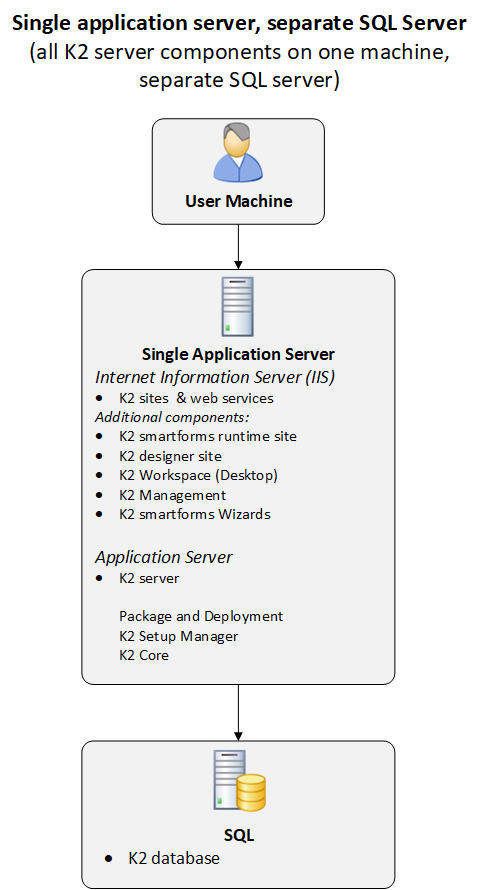 K2 installations can leverage existing infrastructure, for example installing the K2 databases on an existing SQL server. Alternatively, it is common to install the K2 databases on a dedicated SQL server machine. This topology is suitable for smaller environments, such as Development, Test, Training or small-scale Production environments. If scaling for data availability is required, a SQL cluster would be best as this provides a redundant system for data availability.