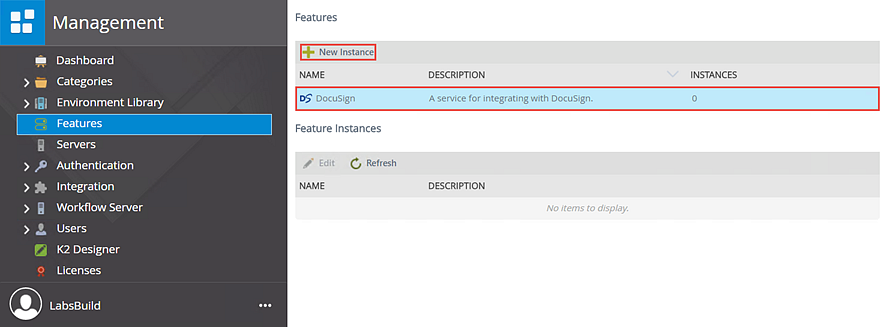 - Once the Feature page has opened, click on DocuSign and click New Instance.