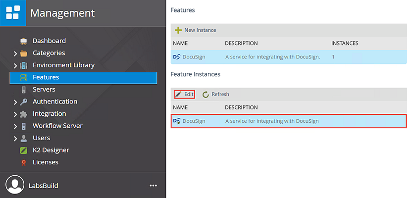 - It is highly recommended to use the DocuSign Feature Activation page to register the necessary Service Instances and other resources to enable K2-DocuSign integration. If the Service Instance is registered using tooling other than the Features page, the DocuSign wizard category will not be added in the relevant workflow design tools.