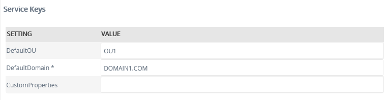 | DefaultOU | Yes | Text | OU1 | Enter the default Organization Unit configured in the Active Directory structure of the environment. |