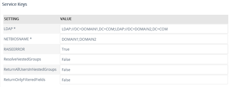 | LDAP | Yes | Text | OU1 | The sequence of the LDAP entries must correspond with the NETBIOSNAME entries. Example: In this example two domains are configured; Domain1 and Domain2. LDAP: LDAP://DC=DOMAIN1,DC=COM; LDAP://DC=DOMAIN2,DC=COM NETBIOSNAME: DOMAIN1;DOMAIN2 . |