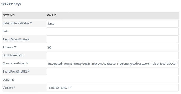 | Version | Yes | Text | 4.10060.1129.0 | This ties to the K2 service type assembly version (the file version of SourceCode.SmartObjects.Services.SharePointV2.dll, which can be found in \Program Files (x86)\K2 blackpearl\ServiceBroker\). |