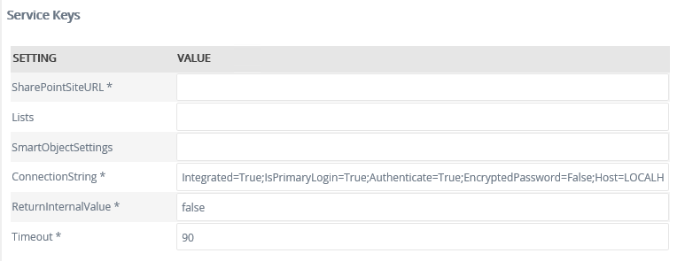 | SmartObjectSettings | Yes | Text | This field is for internal use of the SharePoint K2 SmartObject Service Management feature. It is not necessary to insert a value in this field. |