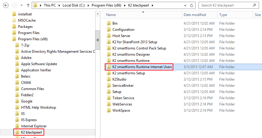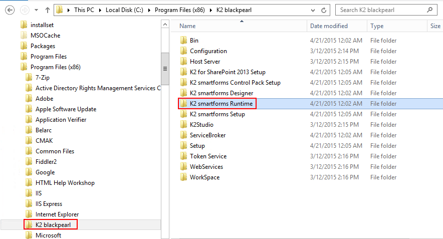 C:\Program Files (x86)\K2 blackpearlThe copy of the SmartForms Runtime folder needs to be in the same install path and also needs to be at the same folder level (i.e. it cannot be nested) in order to share the same license key. If you create the new folder in another location it won’t be licensed and you will receive a licensing error when accessing the new path.