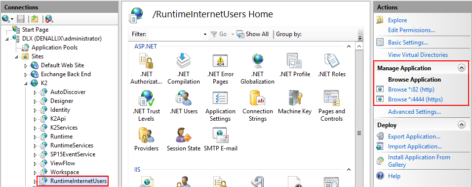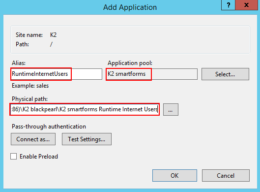 - In Internet Information Services Manager (IIS), under the K2 site, add a new Application.