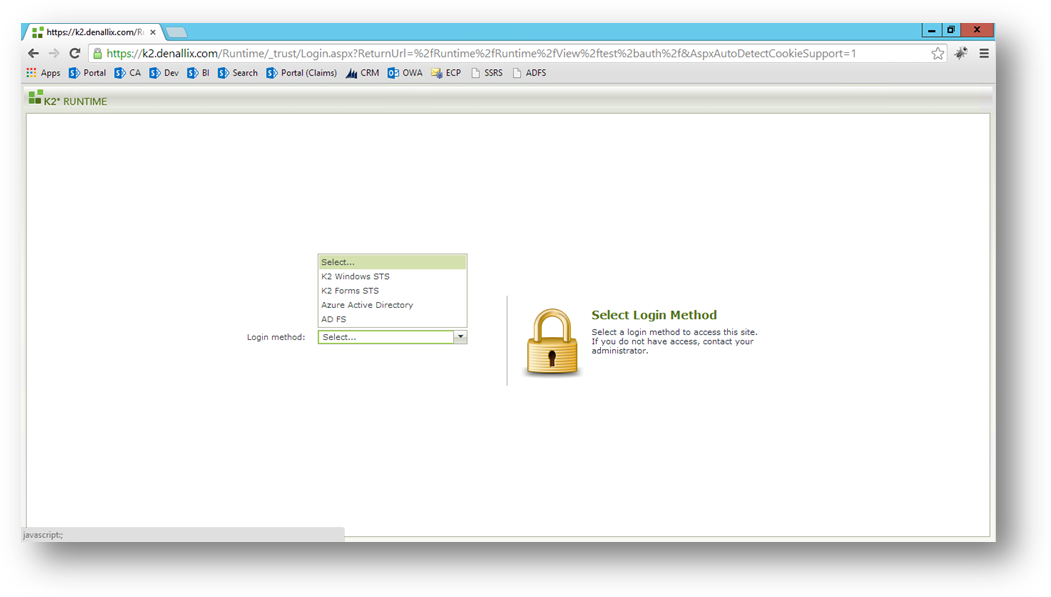 When the user selects an Issuer, or there is only one Issuer for the Realm, the URI that is stored with the Issuer configuration is used to route the user to the appropriate STS for log in. In the case of K2 Windows STS, which uses Windows Authentication, the log in happens without any user interaction. In the case of other STSs like AAD, AD FS and K2 Forms STS a login screen will be presented. The user enters valid credentials and a Security Token is attached to the redirect back to SmartForms and Claims Authentication takes over.