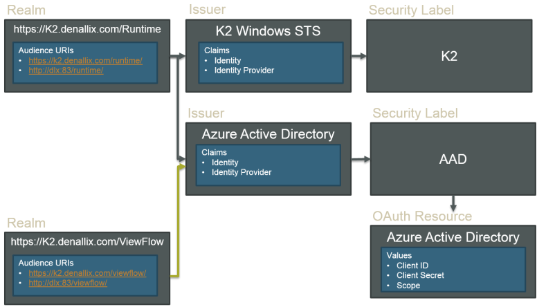 Not all Identity Providers issue claims based security tokens today. Most notably is Active Directory which issues Windows Authentication tokens. To solve this problem K2 has provided a Security Token Service (STS) that converts Windows tokens into claims, known as the K2 Windows STS. Similarly, since Forms Authentication also does not issue claims a K2 Forms STS has also been provided. Systems like Active Directory Federation Services (AD FS) and Azure Active Directory (AAD) issue claims through their own STSs.