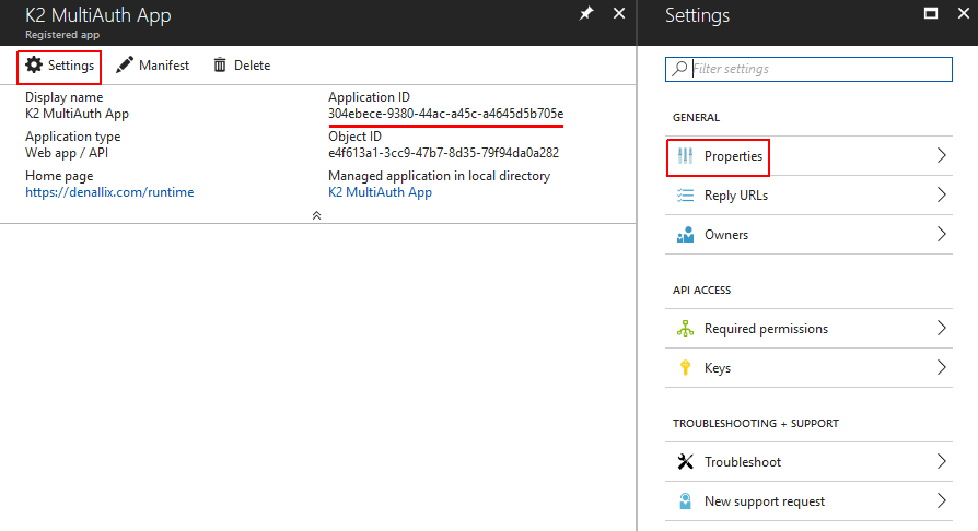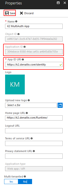 - Application ID / Client ID. You can get it from app properties blade in AAD. Used as Authorization, Token and Refresh value of client_id OAuth resource property in K2.
