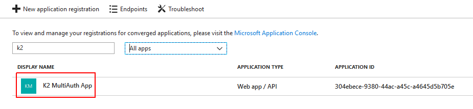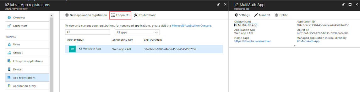 - OAuth 2.0 Authorization Endpoint. Can be copied from App Registration > Endpoints page. Used when adding a New OAuth Resource in K2.