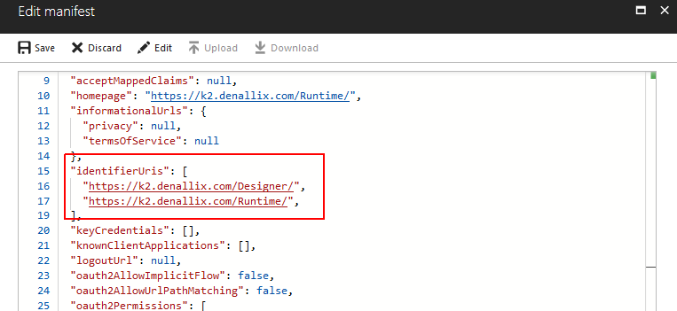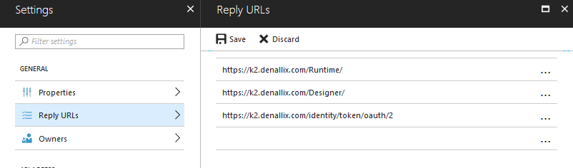 Go back to the Settings blade and click Reply URLs. Add one more Reply URLs to the list:- Token Endpoint Reply URL - https://{K2SiteURL}/identity/token/oauth/2