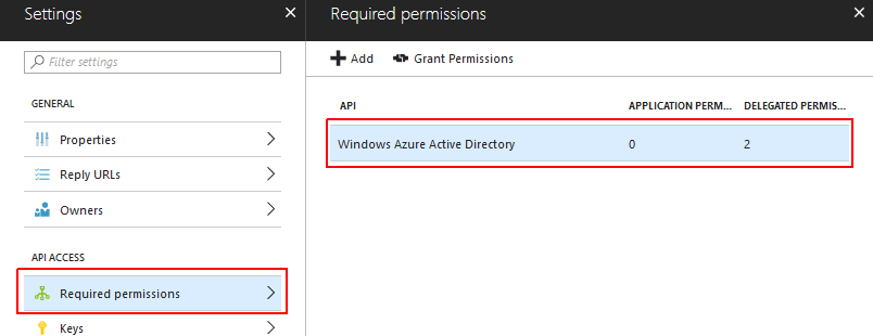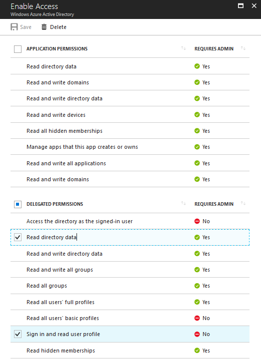 - Select Windows Azure Active Directory and check the Read directory data and Sign in and read user profile in the Delegated Permissions section.