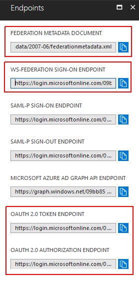 Copy and save the URLs for later use. You need the following items:- Federation Metadata Document URL