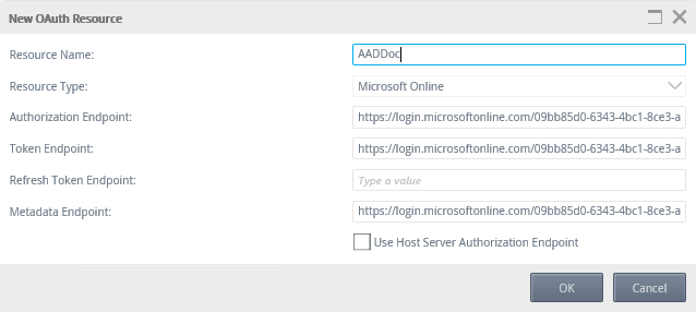 - In the OAuth Resource Name dropdown select Azure Active Directory (this is the resource you created earlier).