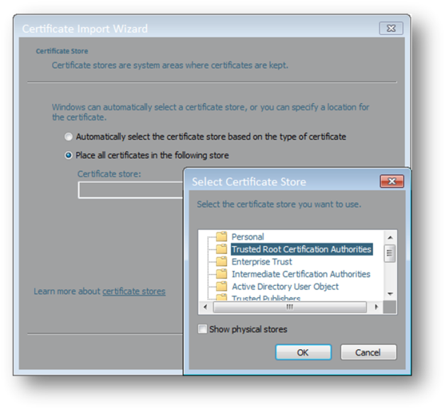 - Select Place all certificates in the following store on the Certificate Import Wizard and choose the Trusted Root Certificate Authorities store.