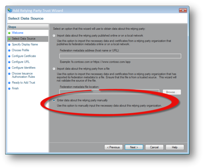 - Select Enter data about the relying party manually and click Next.
