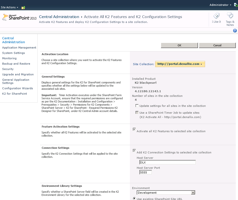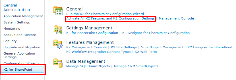 To activate K2 Features and configure K2 Configuration Settings manually, select the K2 for SharePoint tab in SharePoint Central Administration, and click on the Activate All K2 Features and K2 Configuration Settings link.