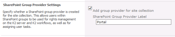 A SharePoint Group Provider is automatically registered by the K2 Setup Manager on the Site Collection you selected at the top of the page. If another SharePoint Group Provider is to be registered to another site collection, you can do it by creating another process portal site and registering the Group Provider manually on the new site collection. SharePoint Groups can then be added to this site and used as destination users, for example.