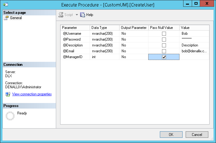 - Locate CustomUM.CreateUser, right click and select Execute Stored Procedure.