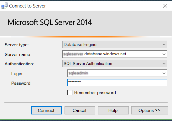 To deploy the extracted .dacpac file, you must use Microsoft SQL Server Management Studio (SSMS) to connect to the Azure SQL Database you created. This topic shows screenshots when using SSMS 2014, but later versions will also work.